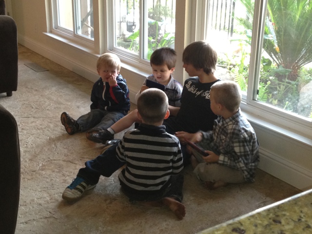 "How much longer to Uncle Martin's and Papa's?" and "Are we there yet?" is all we heard for the almost 6 hour drive to Fresno this week. Once we finally arrived, not only were the boys ecstatic, but they turned Into crazy, endless balls of destructive energy. Preston harassed my brother to play video games with him and wrestle, Ethan searched through every closet and cupboard and whined for Mickey Mouse, and Maverick cooed away with my Dad ( this was the 1st time my dad has met Maverick ). Price and I ate about 3 pounds of See's candy each and totally strayed away from our diets that we swore we would stick to while on vacation. At least Price got up and went to the gym every day, I... Not so much :( I'm pretty horrified to step on the scale when we get home. Oh, and Preston got a chance to play with his cousins for a while (although all he could focus on was their Nintendo DS). It was great to get to see the two of them, but it's kind of hard knowing we're not going to get to spend Christmas together this year. My sisters are spending the holiday with their in laws and the boys and I are headed to San Luis Obispo to see Prices other sisters and their family's. Christmas 2012 will be a Barrett family reunion!!